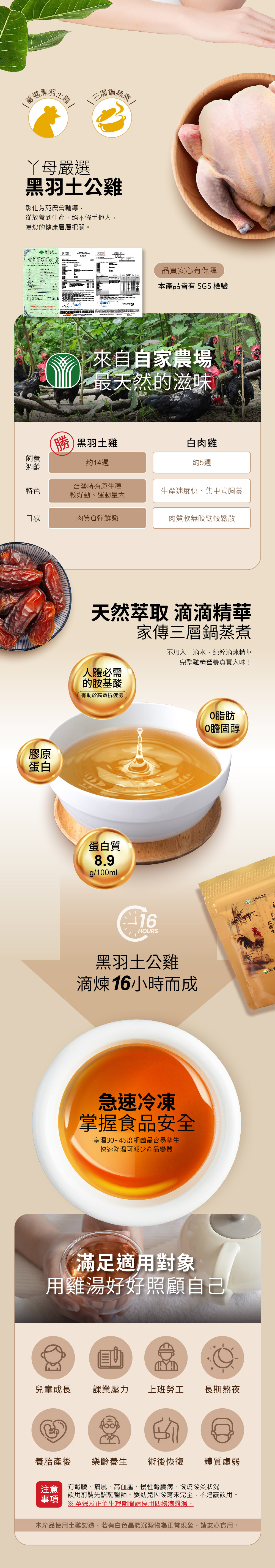 遵循古法慢火精燉16小時而成,食品級過濾、除油,完全不添加防腐劑及人工香料。 滴雞湯含有豐富的膠質及17種人體必須的胺基酸,無腥味、不油膩,乃保健養生之聖品。